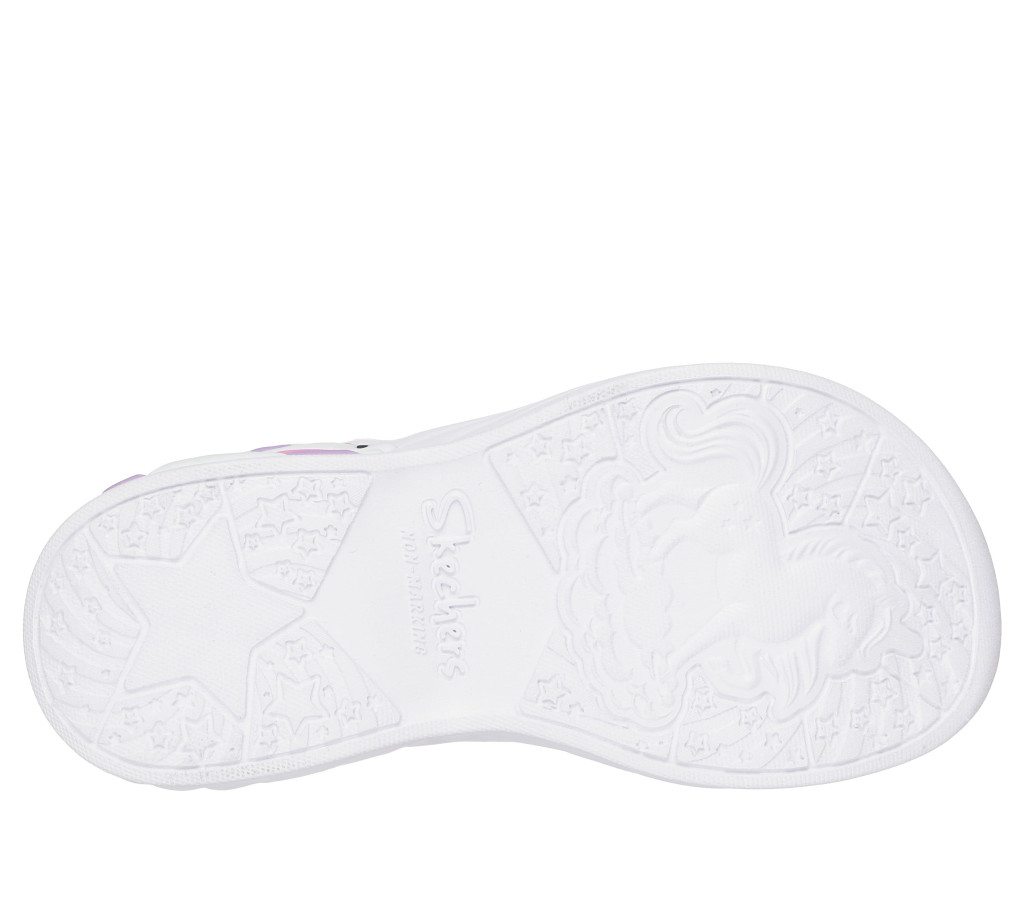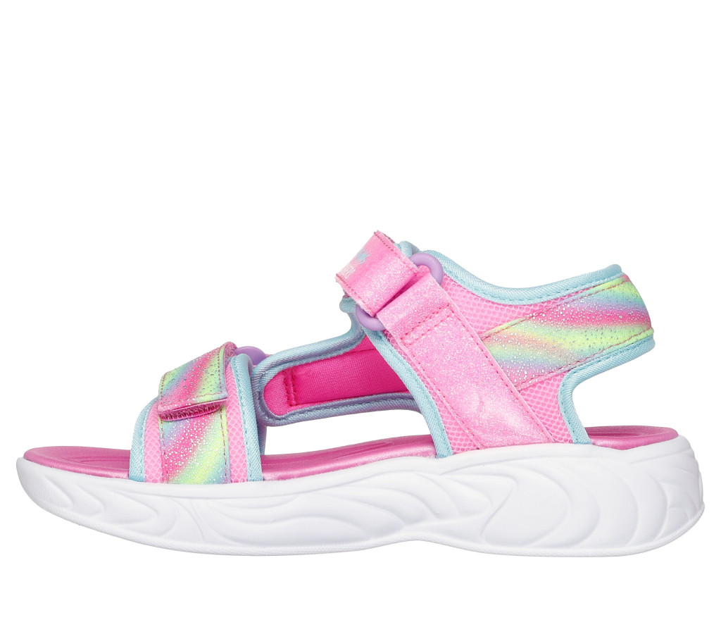 Skechers 303107L-PKMT lány szandál vidám és figyelemfelkeltő választás ovis korú kislányok számára a nyári mindennapokra. A rózsaszín alapot szivárványos színek és imádnivaló unikornisos minta díszíti, amelyet a mozgásra villogó LED-ek tesznek még izgalmasabbá.