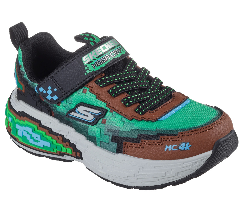 Skechers fiú sportcipő 402160L-BRMT-32 – 32-es méret, trendi Mega-Craft stílusú, zöld, szürke és barna színekkel. Rugalmas, csúszásmentes talpú, mosógépben mosható sportcipő, amely kényelmet és biztonságot nyújt ovis kisfiúk mindennapi viseletére.