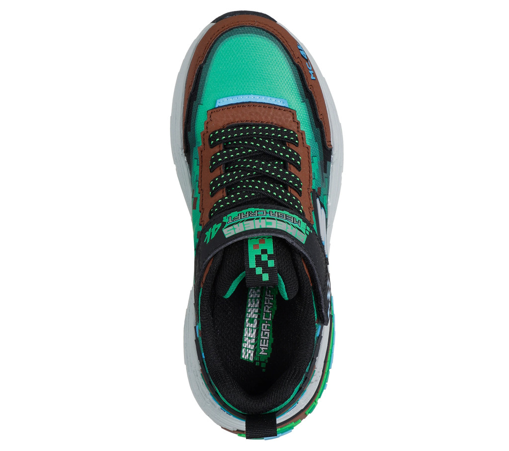 A Skechers Mega-Craft fiú sportcipő a modern dizájn és a praktikum tökéletes keveréke. A pixeles mintás felsőrész zöld, barna és szürke színekkel kombinálva egyedi, játékos megjelenést kölcsönöz. A rugalmas és csúszásbiztos talp kényelmet és biztonságot nyújt, a tépőzáras rögzítés egyszerűvé teszi a cipő használatát. A modell mosógépben is könnyen tisztítható, így a szülők számára rendkívül praktikus.