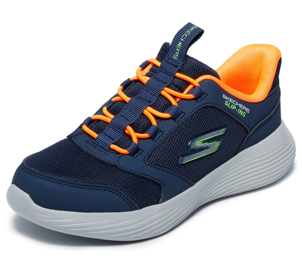 A Skechers 403899L-NVOR-30 Slip-Ins fiú sportcipő tökéletes választás ovis és iskolás korú fiúknak, akik önállóan, gyorsan szeretnék felvenni cipőjüket. A kéz nélkül felvehető Slip-Ins kialakítás és a rugalmas, rögzített fűző maximális kényelmet és stabil tartást biztosít a mindennapokban.