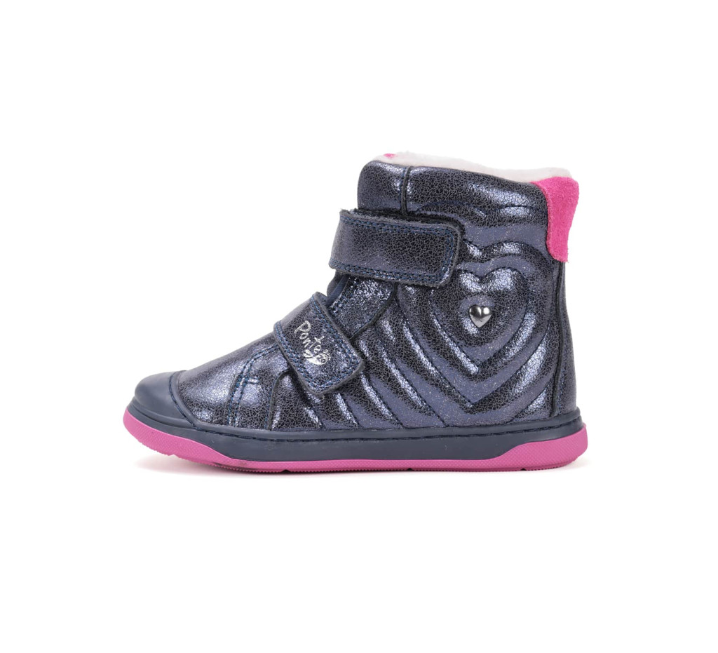 A Ponte20 DA07-5-2475L-29 szupinált lány csizma stílusos, megbízható és kényelmes választás a hideg téli hónapokra. A modell a minőségi anyaghasználatot ötvözi a gyermeklábak egészséges fejlődését támogató szupinált kialakítással. A csillogó kék bőrfelület, a puha rózsaszín részletek és a szívecskés minta elegáns, mégis játékos megjelenést biztosítanak, így a csizma nemcsak praktikus, hanem divatos is – ideális választás ovis és iskolás korú lányok számára.