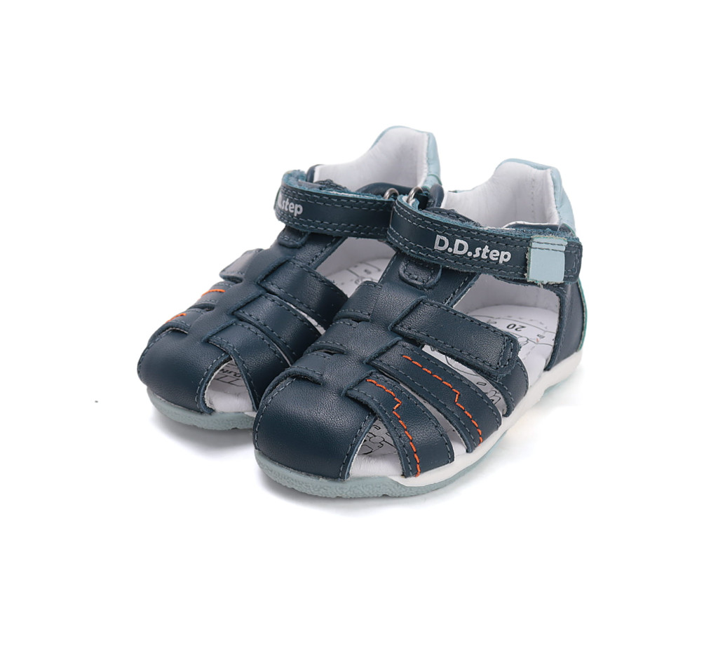 A D.D.Step G111-61843B fiú szandál tökéletes választás a kisebb, bölcsis és ovis korú kisfiúk számára. A sötétkék és világoskék színek harmonikus összhangja, valamint a vagány narancssárga varrások igazán fiús, sportos megjelenést kölcsönöznek ennek a praktikus nyári lábbelinek.