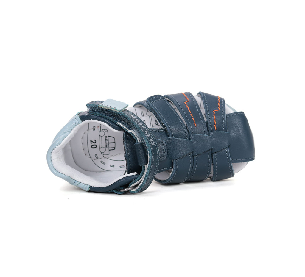 D.D.Step G111-61843B fiú szandál kiváló választás bölcsis és ovis korú kisfiúk számára a nyári mindennapokra, akár szabadtéri játékhoz, akár bölcsődei vagy óvodai váltócipőként. A sötétkék és világoskék színkombináció harmonikus, mégis karakteres megjelenést biztosít, amelyet a narancssárga varrások tesznek izgalmassá.