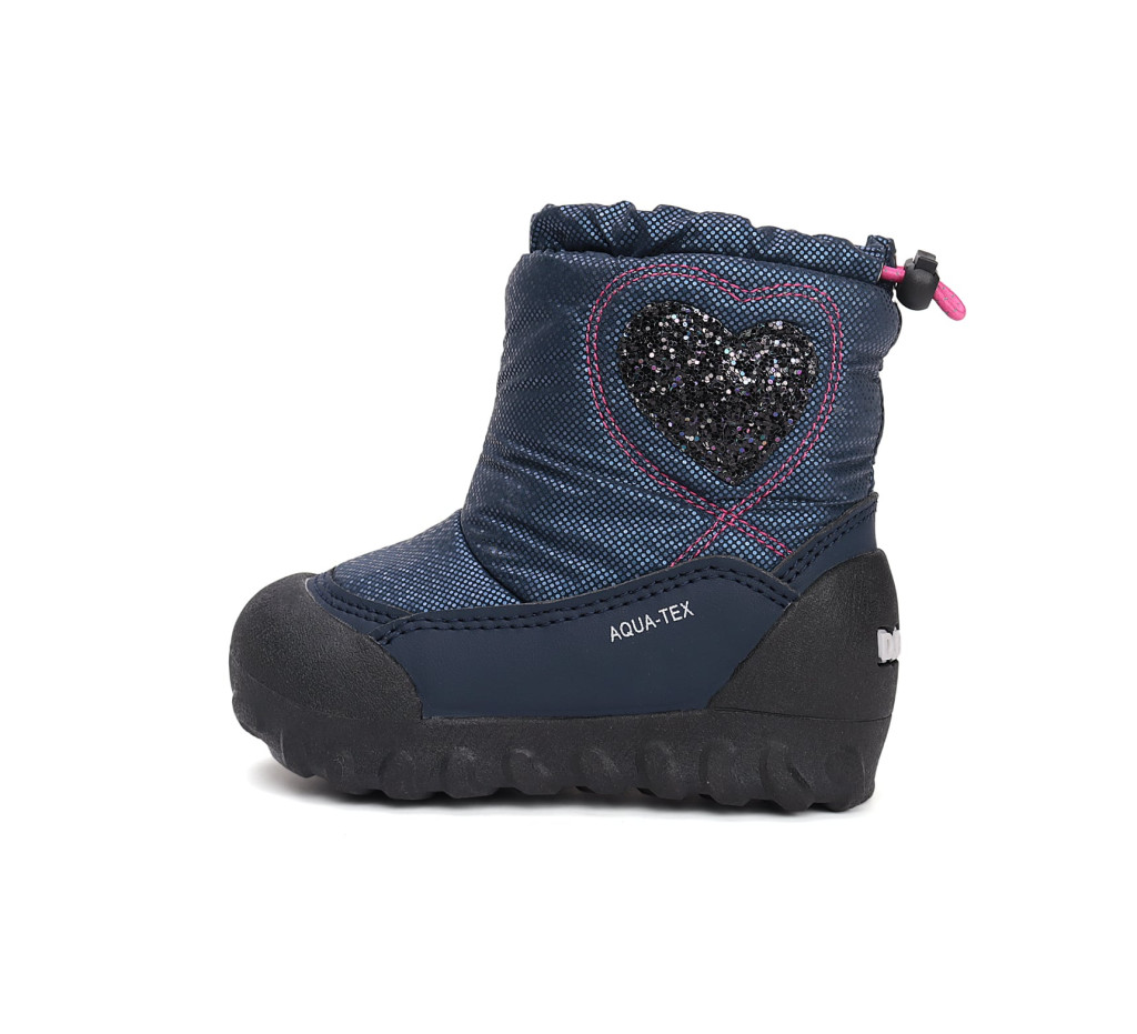 A D.D.Step P079-52384L modell egy bájos és praktikus lány hótaposó, amely a hideg, havas napokon is megbízható társ. A cipő Aqua-Tex vízálló technológiával készült, belül pedig puha bundás béléssel melegíti a lábat. A csúszásmentes talp biztonságos lépteket garantál, míg a bebújós fazon és az egy darab rugalmas rögzítő gumi megkönnyíti a felvételt. A kék és rózsaszín árnyalatok, valamint a csillogó szívecske minta igazi kislányos, kedves megjelenést kölcsönöznek a csizmának.