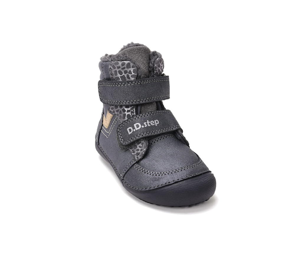 A D.D.Step W063-52804EM barefoot lány csizma nemcsak funkcionális, hanem kifejezetten divatos is. A visszafogott szürke színvilágot a csillogó arany betétek és a játékos leopárd mintás elemek teszik különlegessé. Ez a dizájn egyszerre modern és vagány, így tökéletesen illik a kis kalandorok téli öltözékéhez – legyen szó óvodáról, sétáról vagy családi kirándulásról.
